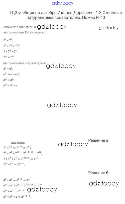 На страницах сайта gdz.today вы найдете учебный и вспомогательный материал, направленный на улучшения знаний школьной программы. ГДЗ - онлайн мир знаний Решение к упражнениям 43 Учебнику по Алгебре для 7 класса Дорофеев, Суворова Просвещение Академический школьный учебник 2020
