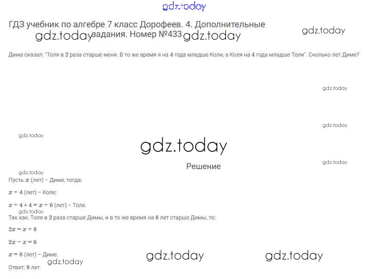 На страницах сайта gdz.today вы найдете учебный и вспомогательный материал, направленный на улучшения знаний школьной программы. ГДЗ - онлайн мир знаний Решение к упражнениям 433 Учебнику по Алгебре для 7 класса Дорофеев, Суворова Просвещение Академический школьный учебник 2020
