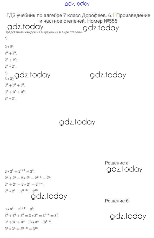 На страницах сайта gdz.today вы найдете учебный и вспомогательный материал, направленный на улучшения знаний школьной программы. ГДЗ - онлайн мир знаний Решение к упражнениям 555 Учебнику по Алгебре для 7 класса Дорофеев, Суворова Просвещение Академический школьный учебник 2020