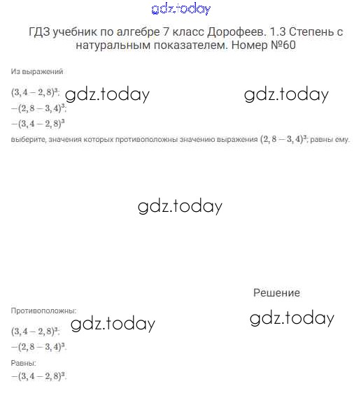 На страницах сайта gdz.today вы найдете учебный и вспомогательный материал, направленный на улучшения знаний школьной программы. ГДЗ - онлайн мир знаний Решение к упражнениям 60 Учебнику по Алгебре для 7 класса Дорофеев, Суворова Просвещение Академический школьный учебник 2020