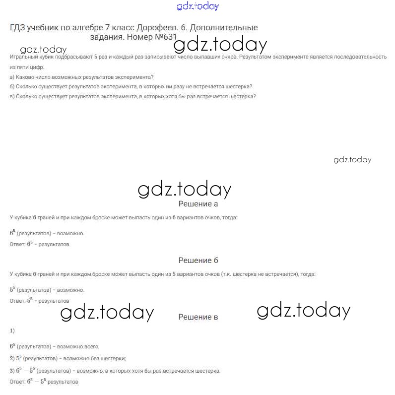 На страницах сайта gdz.today вы найдете учебный и вспомогательный материал, направленный на улучшения знаний школьной программы. ГДЗ - онлайн мир знаний Решение к упражнениям 631 Учебнику по Алгебре для 7 класса Дорофеев, Суворова Просвещение Академический школьный учебник 2020
