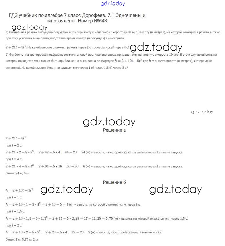 На страницах сайта gdz.today вы найдете учебный и вспомогательный материал, направленный на улучшения знаний школьной программы. ГДЗ - онлайн мир знаний Решение к упражнениям 643 Учебнику по Алгебре для 7 класса Дорофеев, Суворова Просвещение Академический школьный учебник 2020