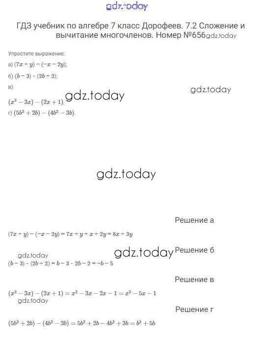 На страницах сайта gdz.today вы найдете учебный и вспомогательный материал, направленный на улучшения знаний школьной программы. ГДЗ - онлайн мир знаний Решение к упражнениям 656 Учебнику по Алгебре для 7 класса Дорофеев, Суворова Просвещение Академический школьный учебник 2020
