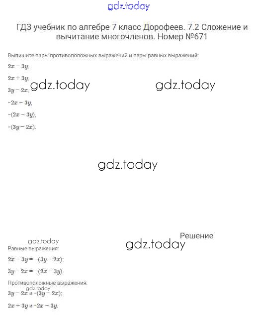 На страницах сайта gdz.today вы найдете учебный и вспомогательный материал, направленный на улучшения знаний школьной программы. ГДЗ - онлайн мир знаний Решение к упражнениям 671 Учебнику по Алгебре для 7 класса Дорофеев, Суворова Просвещение Академический школьный учебник 2020