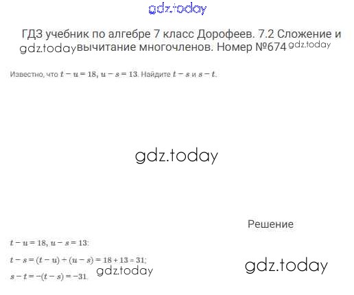 На страницах сайта gdz.today вы найдете учебный и вспомогательный материал, направленный на улучшения знаний школьной программы. ГДЗ - онлайн мир знаний Решение к упражнениям 674 Учебнику по Алгебре для 7 класса Дорофеев, Суворова Просвещение Академический школьный учебник 2020