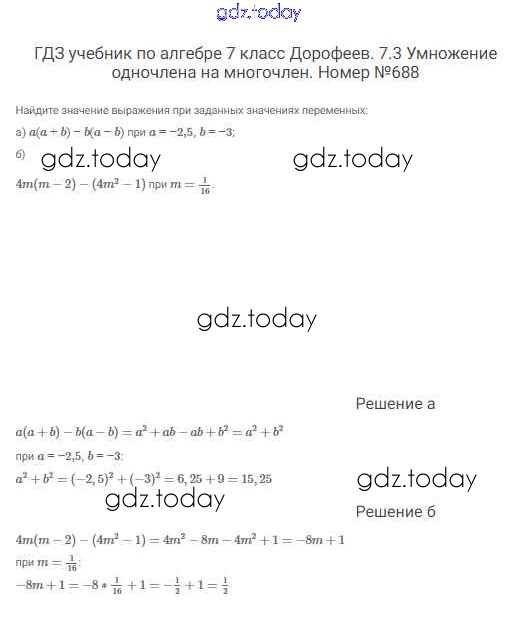 На страницах сайта gdz.today вы найдете учебный и вспомогательный материал, направленный на улучшения знаний школьной программы. ГДЗ - онлайн мир знаний Решение к упражнениям 688 Учебнику по Алгебре для 7 класса Дорофеев, Суворова Просвещение Академический школьный учебник 2020