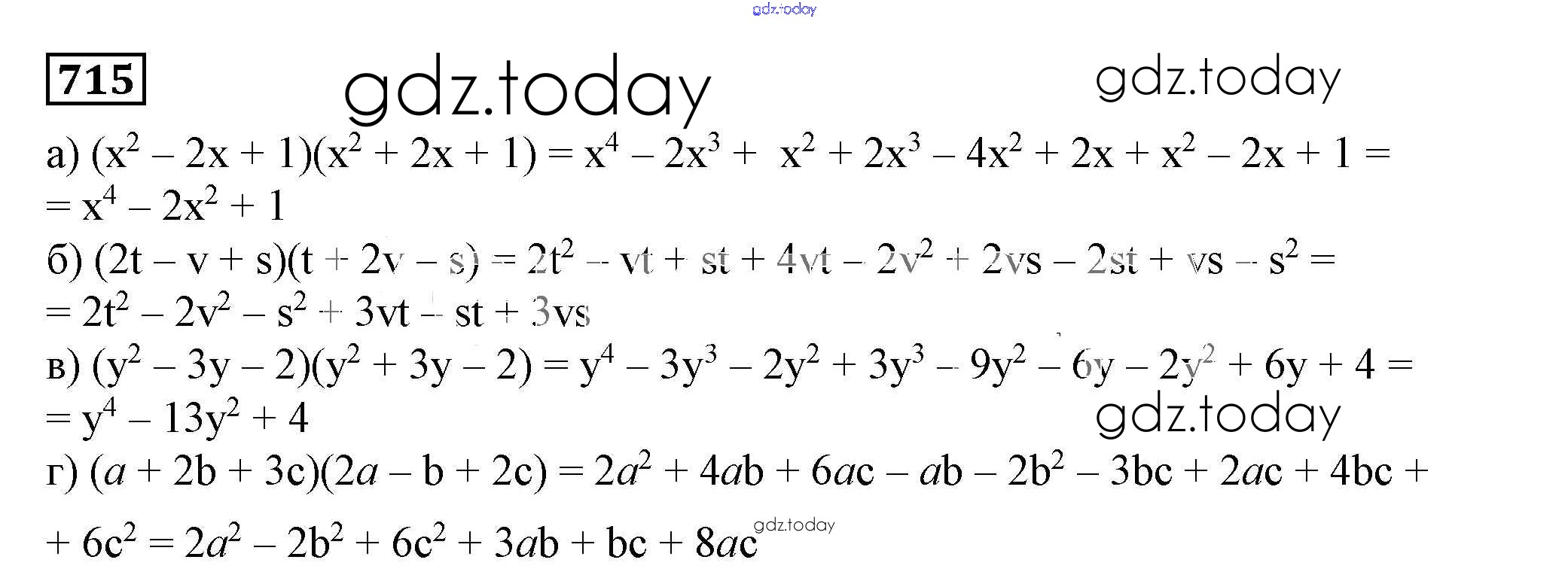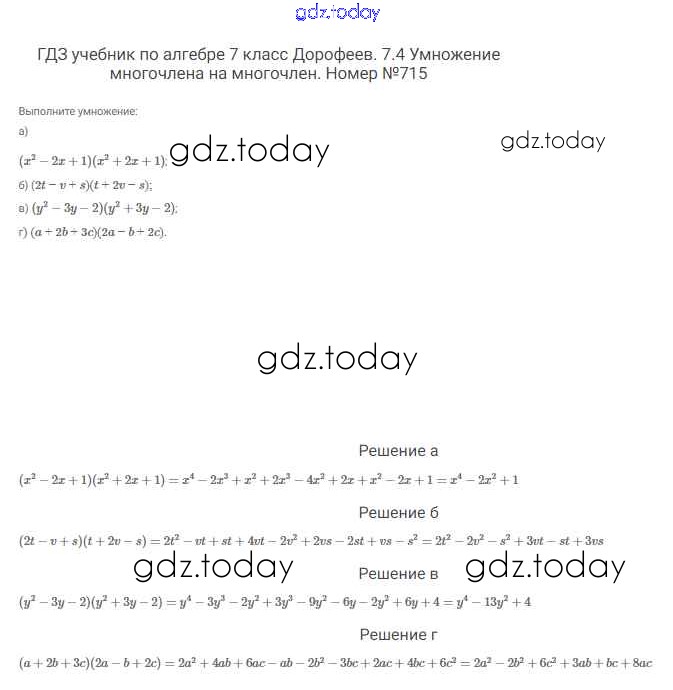 На страницах сайта gdz.today вы найдете учебный и вспомогательный материал, направленный на улучшения знаний школьной программы. ГДЗ - онлайн мир знаний Решение к упражнениям 715 Учебнику по Алгебре для 7 класса Дорофеев, Суворова Просвещение Академический школьный учебник 2020