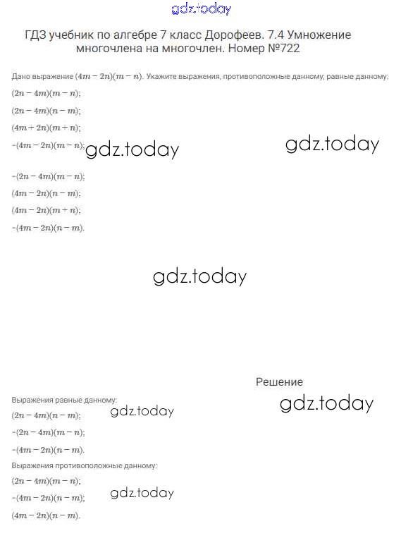 На страницах сайта gdz.today вы найдете учебный и вспомогательный материал, направленный на улучшения знаний школьной программы. ГДЗ - онлайн мир знаний Решение к упражнениям 722 Учебнику по Алгебре для 7 класса Дорофеев, Суворова Просвещение Академический школьный учебник 2020