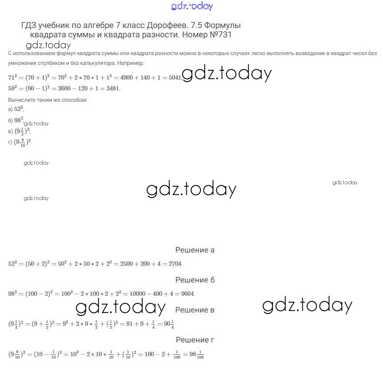 На страницах сайта gdz.today вы найдете учебный и вспомогательный материал, направленный на улучшения знаний школьной программы. ГДЗ - онлайн мир знаний Решение к упражнениям 731 Учебнику по Алгебре для 7 класса Дорофеев, Суворова Просвещение Академический школьный учебник 2020