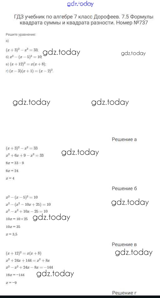 На страницах сайта gdz.today вы найдете учебный и вспомогательный материал, направленный на улучшения знаний школьной программы. ГДЗ - онлайн мир знаний Решение к упражнениям 737 Учебнику по Алгебре для 7 класса Дорофеев, Суворова Просвещение Академический школьный учебник 2020