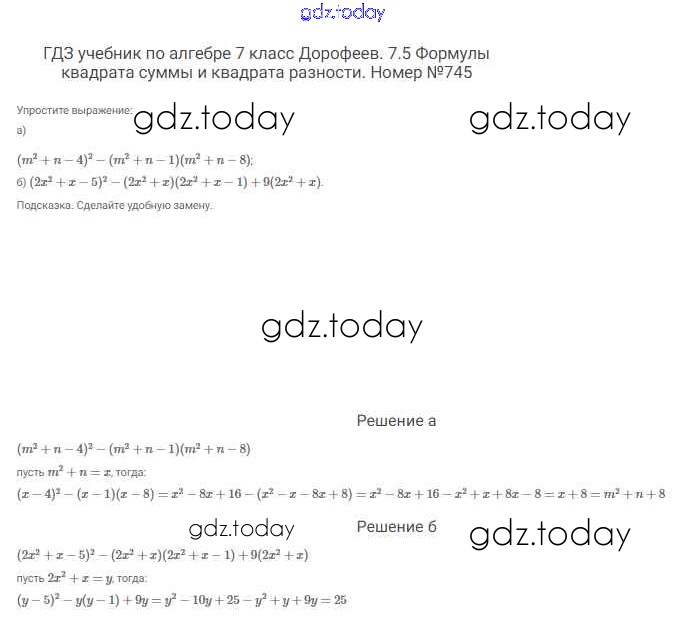 На страницах сайта gdz.today вы найдете учебный и вспомогательный материал, направленный на улучшения знаний школьной программы. ГДЗ - онлайн мир знаний Решение к упражнениям 745 Учебнику по Алгебре для 7 класса Дорофеев, Суворова Просвещение Академический школьный учебник 2020