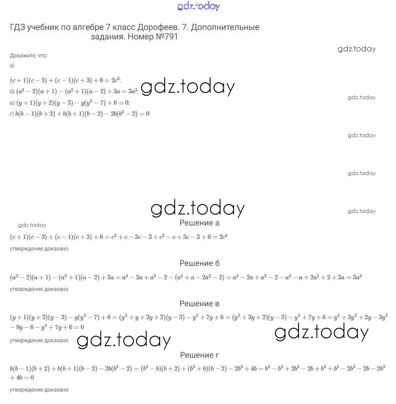 На страницах сайта gdz.today вы найдете учебный и вспомогательный материал, направленный на улучшения знаний школьной программы. ГДЗ - онлайн мир знаний Решение к упражнениям 791 Учебнику по Алгебре для 7 класса Дорофеев, Суворова Просвещение Академический школьный учебник 2020