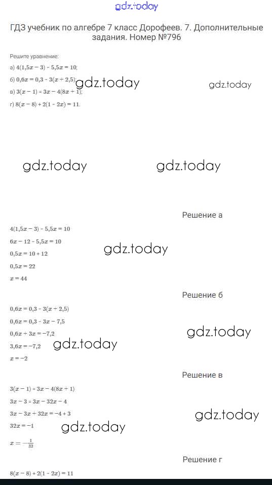 На страницах сайта gdz.today вы найдете учебный и вспомогательный материал, направленный на улучшения знаний школьной программы. ГДЗ - онлайн мир знаний Решение к упражнениям 796 Учебнику по Алгебре для 7 класса Дорофеев, Суворова Просвещение Академический школьный учебник 2020