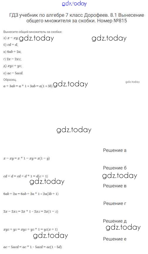 На страницах сайта gdz.today вы найдете учебный и вспомогательный материал, направленный на улучшения знаний школьной программы. ГДЗ - онлайн мир знаний Решение к упражнениям 815 Учебнику по Алгебре для 7 класса Дорофеев, Суворова Просвещение Академический школьный учебник 2020