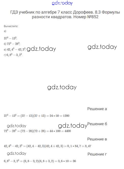 На страницах сайта gdz.today вы найдете учебный и вспомогательный материал, направленный на улучшения знаний школьной программы. ГДЗ - онлайн мир знаний Решение к упражнениям 852 Учебнику по Алгебре для 7 класса Дорофеев, Суворова Просвещение Академический школьный учебник 2020