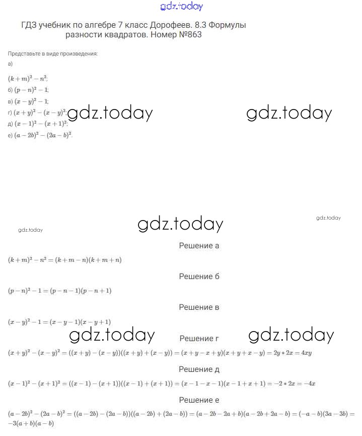 На страницах сайта gdz.today вы найдете учебный и вспомогательный материал, направленный на улучшения знаний школьной программы. ГДЗ - онлайн мир знаний Решение к упражнениям 863 Учебнику по Алгебре для 7 класса Дорофеев, Суворова Просвещение Академический школьный учебник 2020