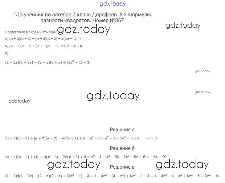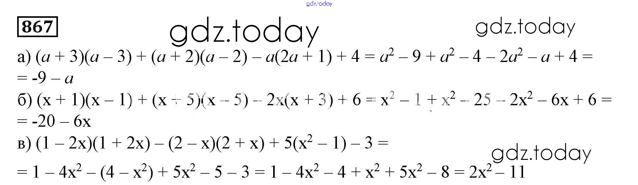 На страницах сайта gdz.today вы найдете учебный и вспомогательный материал, направленный на улучшения знаний школьной программы. ГДЗ - онлайн мир знаний Решение к упражнениям 867 Учебнику по Алгебре для 7 класса Дорофеев, Суворова Просвещение Академический школьный учебник 2020