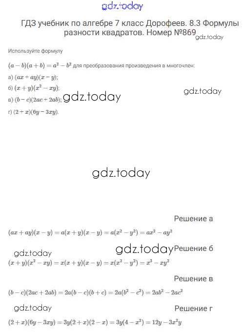 На страницах сайта gdz.today вы найдете учебный и вспомогательный материал, направленный на улучшения знаний школьной программы. ГДЗ - онлайн мир знаний Решение к упражнениям 869 Учебнику по Алгебре для 7 класса Дорофеев, Суворова Просвещение Академический школьный учебник 2020