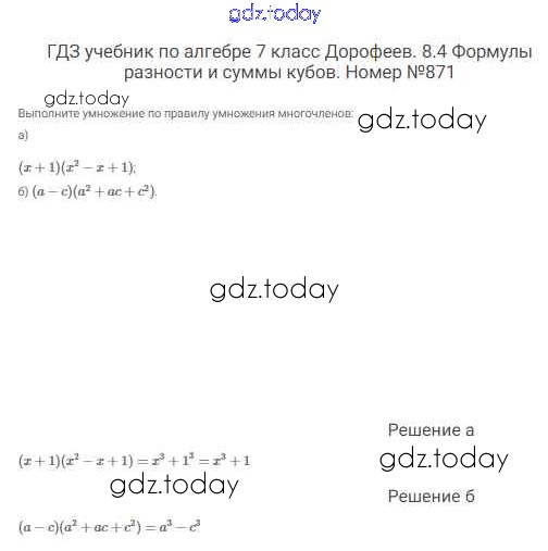 На страницах сайта gdz.today вы найдете учебный и вспомогательный материал, направленный на улучшения знаний школьной программы. ГДЗ - онлайн мир знаний Решение к упражнениям 871 Учебнику по Алгебре для 7 класса Дорофеев, Суворова Просвещение Академический школьный учебник 2020