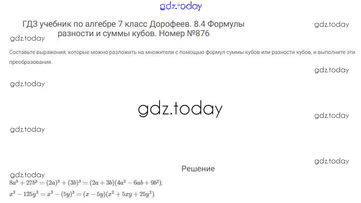 На страницах сайта gdz.today вы найдете учебный и вспомогательный материал, направленный на улучшения знаний школьной программы. ГДЗ - онлайн мир знаний Решение к упражнениям 876 Учебнику по Алгебре для 7 класса Дорофеев, Суворова Просвещение Академический школьный учебник 2020