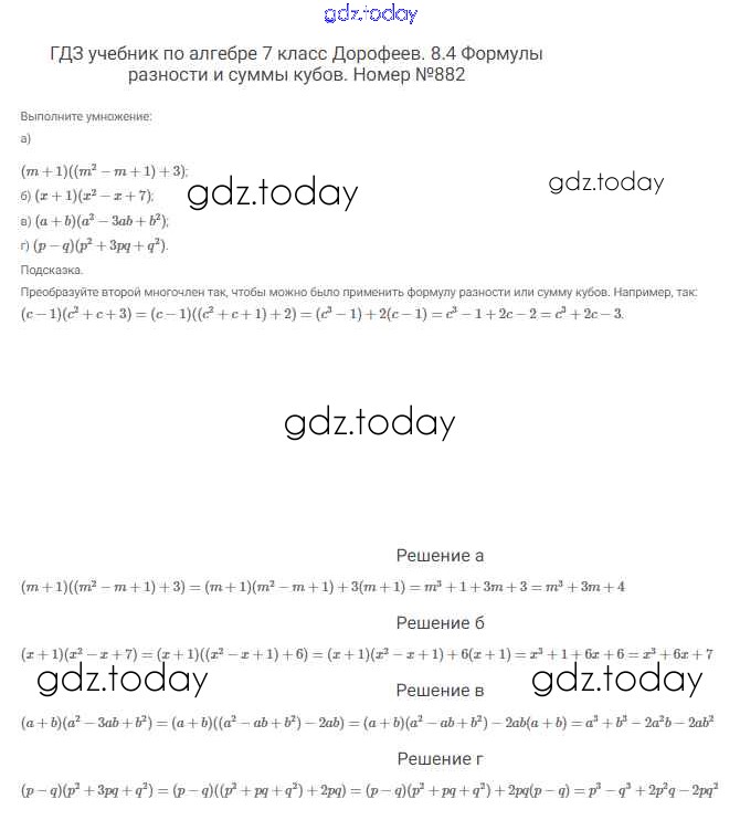 На страницах сайта gdz.today вы найдете учебный и вспомогательный материал, направленный на улучшения знаний школьной программы. ГДЗ - онлайн мир знаний Решение к упражнениям 882 Учебнику по Алгебре для 7 класса Дорофеев, Суворова Просвещение Академический школьный учебник 2020