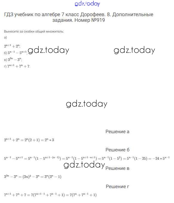 На страницах сайта gdz.today вы найдете учебный и вспомогательный материал, направленный на улучшения знаний школьной программы. ГДЗ - онлайн мир знаний Решение к упражнениям 919 Учебнику по Алгебре для 7 класса Дорофеев, Суворова Просвещение Академический школьный учебник 2020
