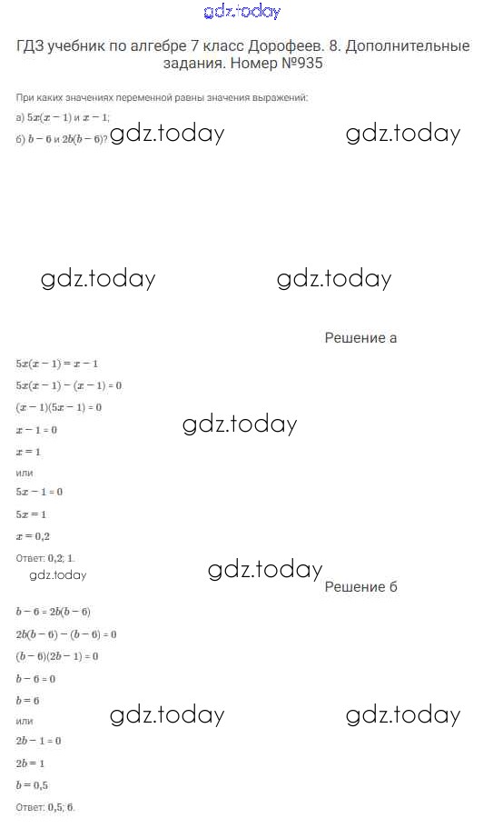 На страницах сайта gdz.today вы найдете учебный и вспомогательный материал, направленный на улучшения знаний школьной программы. ГДЗ - онлайн мир знаний Решение к упражнениям 935 Учебнику по Алгебре для 7 класса Дорофеев, Суворова Просвещение Академический школьный учебник 2020