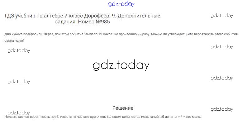 На страницах сайта gdz.today вы найдете учебный и вспомогательный материал, направленный на улучшения знаний школьной программы. ГДЗ - онлайн мир знаний Решение к упражнениям 985 Учебнику по Алгебре для 7 класса Дорофеев, Суворова Просвещение Академический школьный учебник 2020