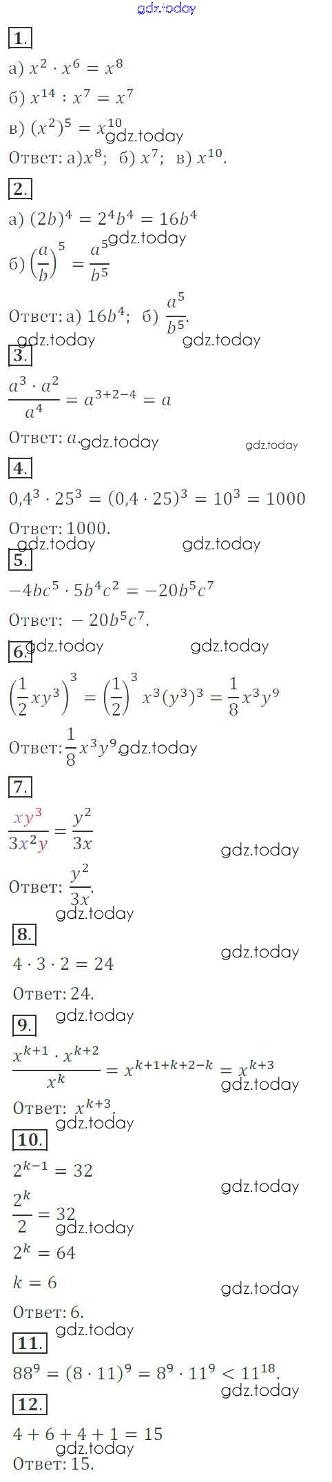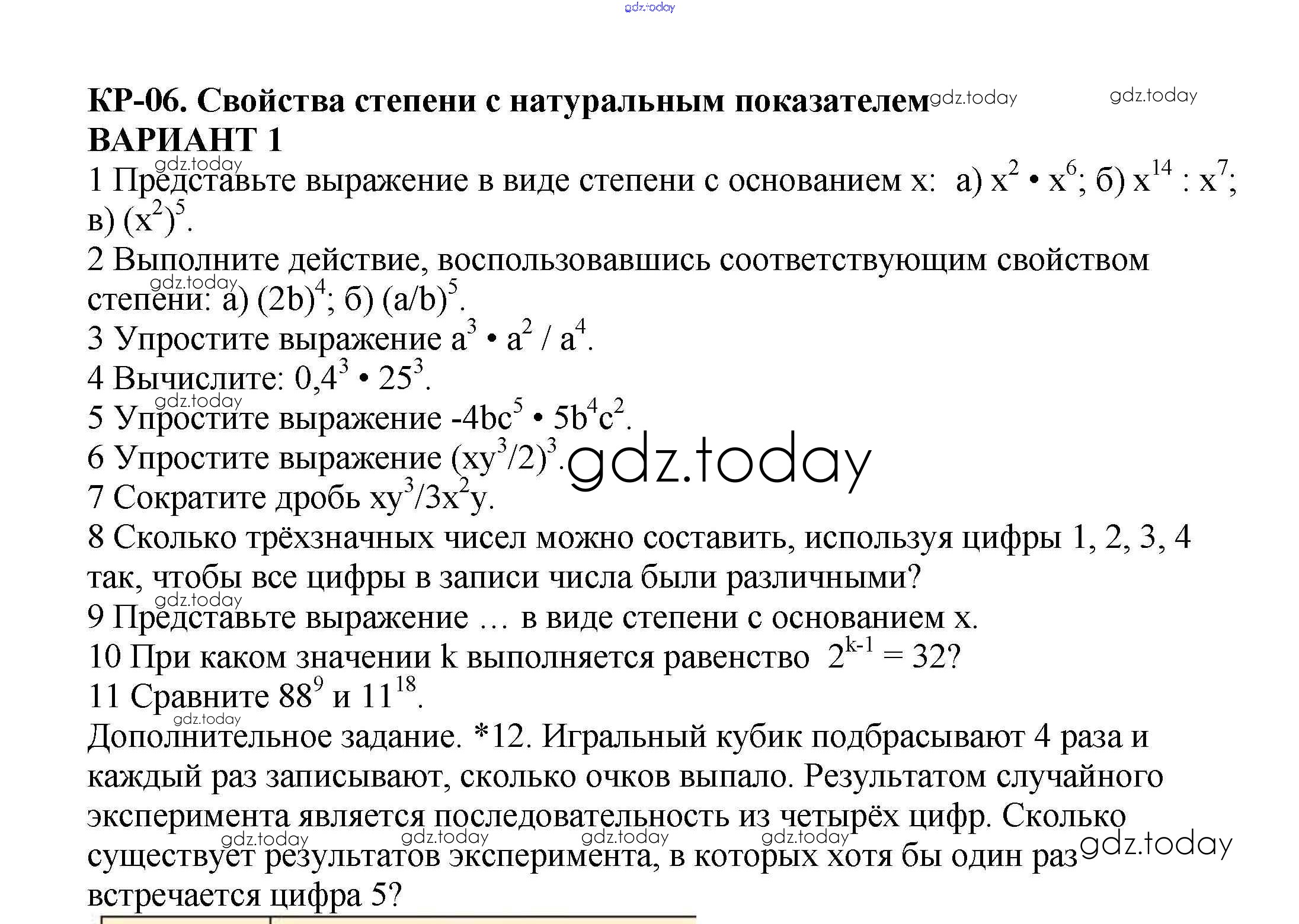 На страницах сайта gdz.today вы найдете учебный и вспомогательный материал, направленный на улучшения знаний школьной программы. ГДЗ - онлайн мир знаний Решение к контрольной работе №6. Свойства степени с натуральным показателем Вариант 1 Контрольным работам по Алгебре для 7 класса Кузнецова, Минаева Просвещение 2018