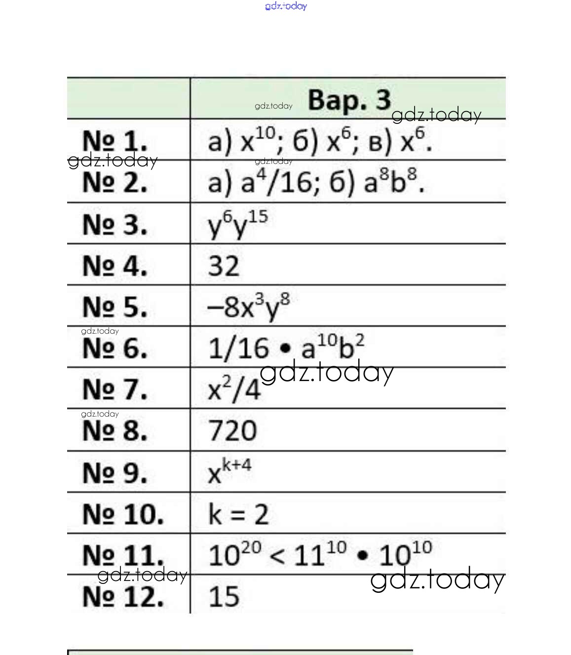 На страницах сайта gdz.today вы найдете учебный и вспомогательный материал, направленный на улучшения знаний школьной программы. ГДЗ - онлайн мир знаний Решение к контрольной работе №6. Свойства степени с натуральным показателем Вариант 3 Контрольным работам по Алгебре для 7 класса Кузнецова, Минаева Просвещение 2018