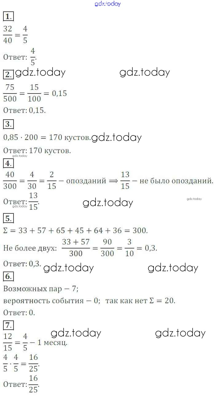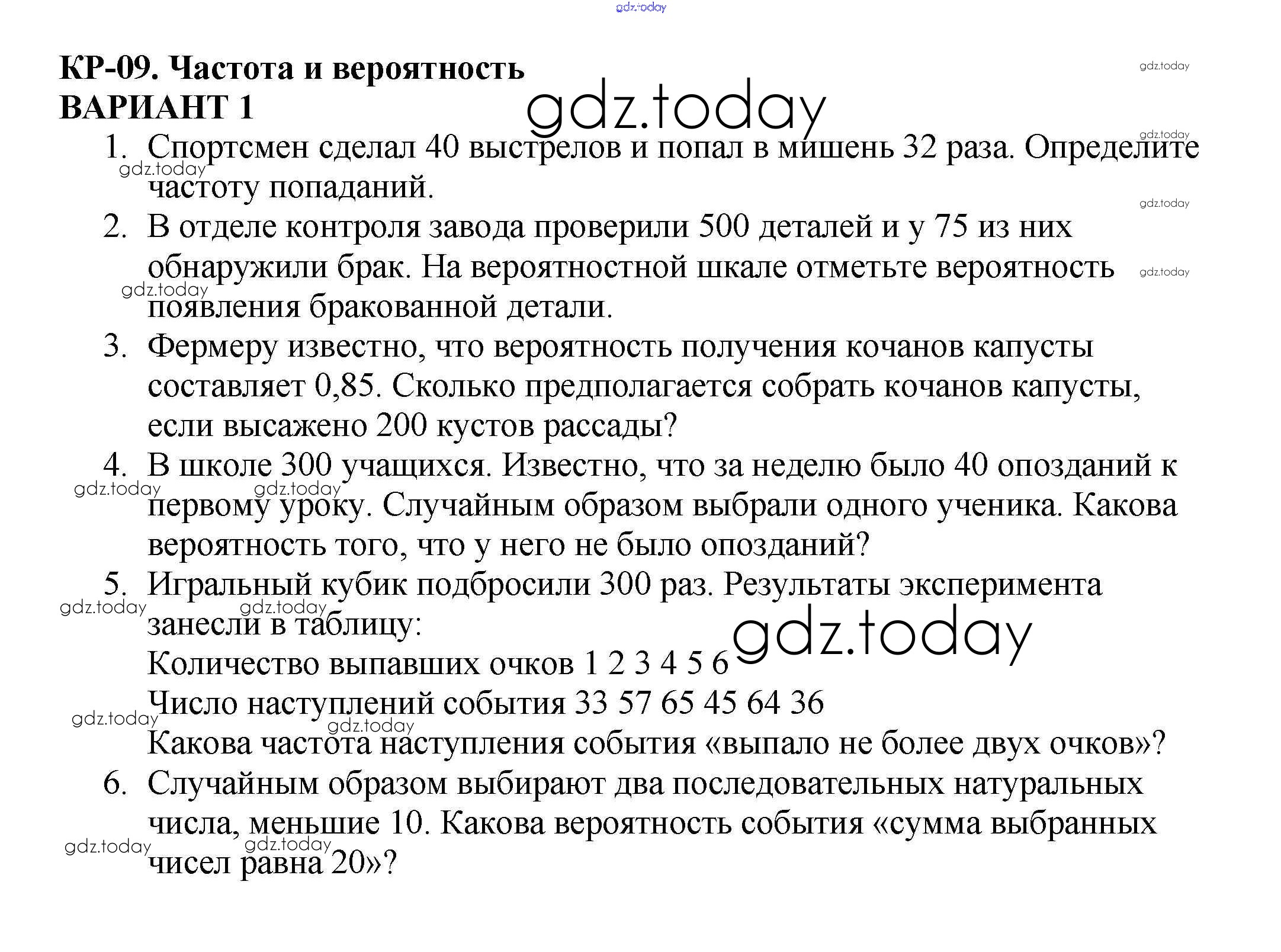 На страницах сайта gdz.today вы найдете учебный и вспомогательный материал, направленный на улучшения знаний школьной программы. ГДЗ - онлайн мир знаний Решение к контрольной работе №9. Частота и вероятность Вариант 1 Контрольным работам по Алгебре для 7 класса Кузнецова, Минаева Просвещение 2018