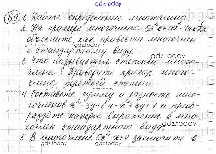 На страницах сайта gdz.today вы найдете учебный и вспомогательный материал, направленный на улучшения знаний школьной программы. ГДЗ - онлайн мир знаний Решение. Контрольные вопросы и задания §9 Учебнику по Алгебре для 7 класса Макарычев, Миндюк Просвещение 2015