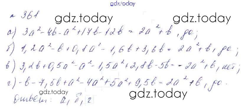 На страницах сайта gdz.today вы найдете учебный и вспомогательный материал, направленный на улучшения знаний школьной программы. ГДЗ - онлайн мир знаний Решение к упражнениям 361 Учебнику по Алгебре для 7 класса Макарычев, Миндюк Углубленный уровень Мнемозина УМК 2013
