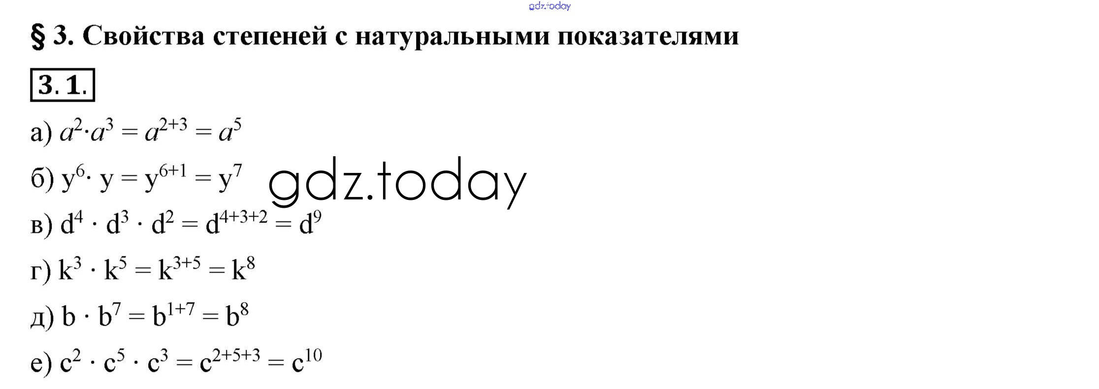 На страницах сайта gdz.today вы найдете учебный и вспомогательный материал, направленный на улучшения знаний школьной программы. ГДЗ - онлайн мир знаний Решение к §3. Свойства степеней с натуральными показателями 3.1 Учебнику по Алгебре для 7 класса Мордкович, Семёнов Просвещение 2018