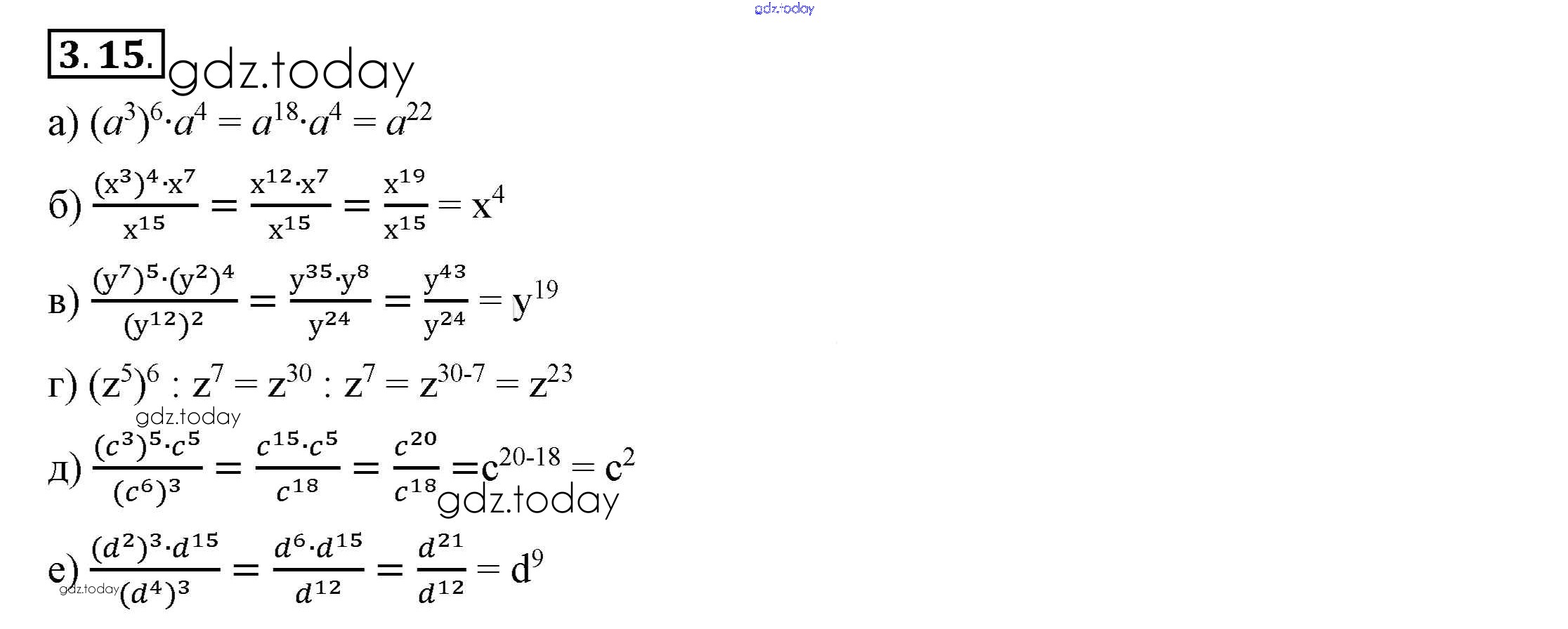 На страницах сайта gdz.today вы найдете учебный и вспомогательный материал, направленный на улучшения знаний школьной программы. ГДЗ - онлайн мир знаний Решение к §3. Свойства степеней с натуральными показателями 3.15 Учебнику по Алгебре для 7 класса Мордкович, Семёнов Просвещение 2018
