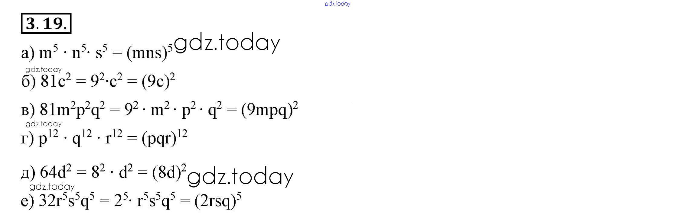 На страницах сайта gdz.today вы найдете учебный и вспомогательный материал, направленный на улучшения знаний школьной программы. ГДЗ - онлайн мир знаний Решение к §3. Свойства степеней с натуральными показателями 3.19 Учебнику по Алгебре для 7 класса Мордкович, Семёнов Просвещение 2018