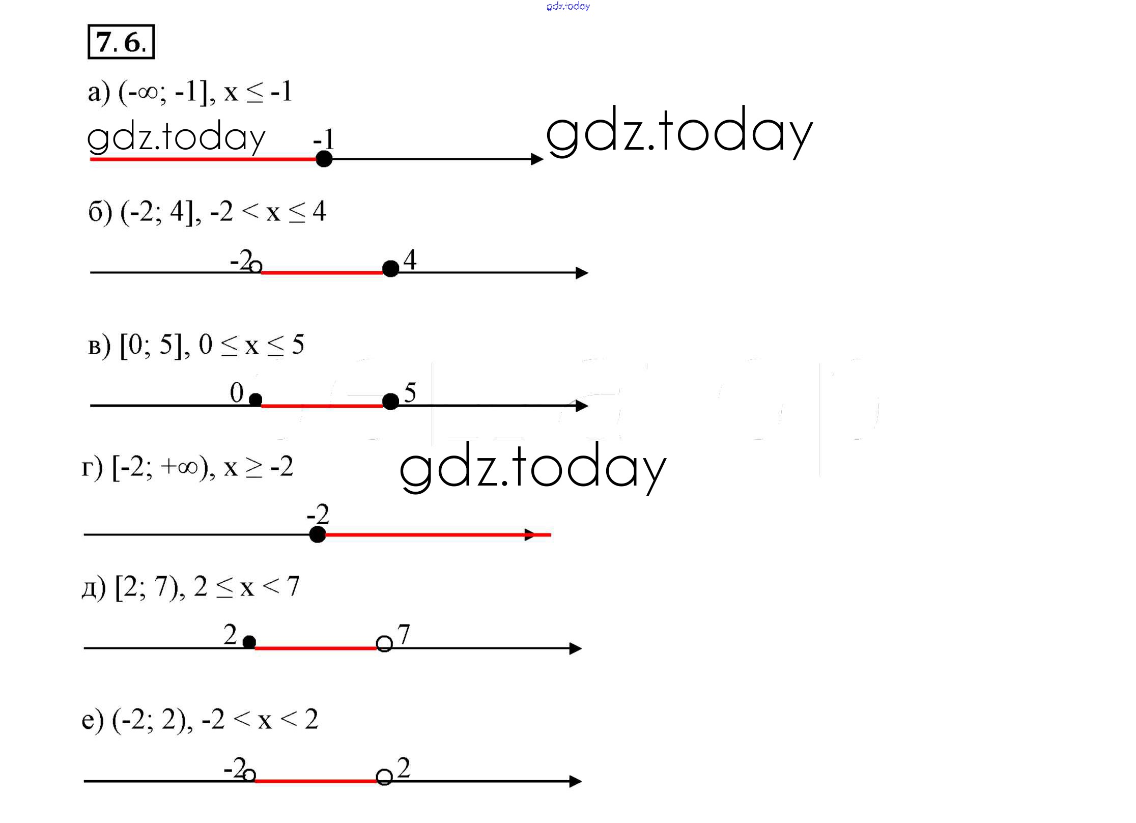 На страницах сайта gdz.today вы найдете учебный и вспомогательный материал, направленный на улучшения знаний школьной программы. ГДЗ - онлайн мир знаний Решение к §7. Числовые промежутки на координатной прямой 7.6 Учебнику по Алгебре для 7 класса Мордкович, Семёнов Просвещение 2018