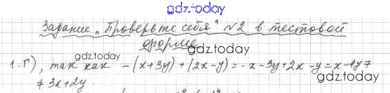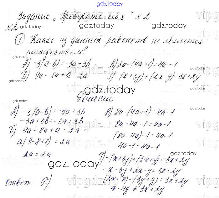 На страницах сайта gdz.today вы найдете учебный и вспомогательный материал, направленный на улучшения знаний школьной программы. ГДЗ - онлайн мир знаний 2 Проверь себя (решение) 1 Учебнику по Алгебре для 7 класса Мерзляк, Полонский Базовый уровень Вентана-граф Алгоритм успеха 2016