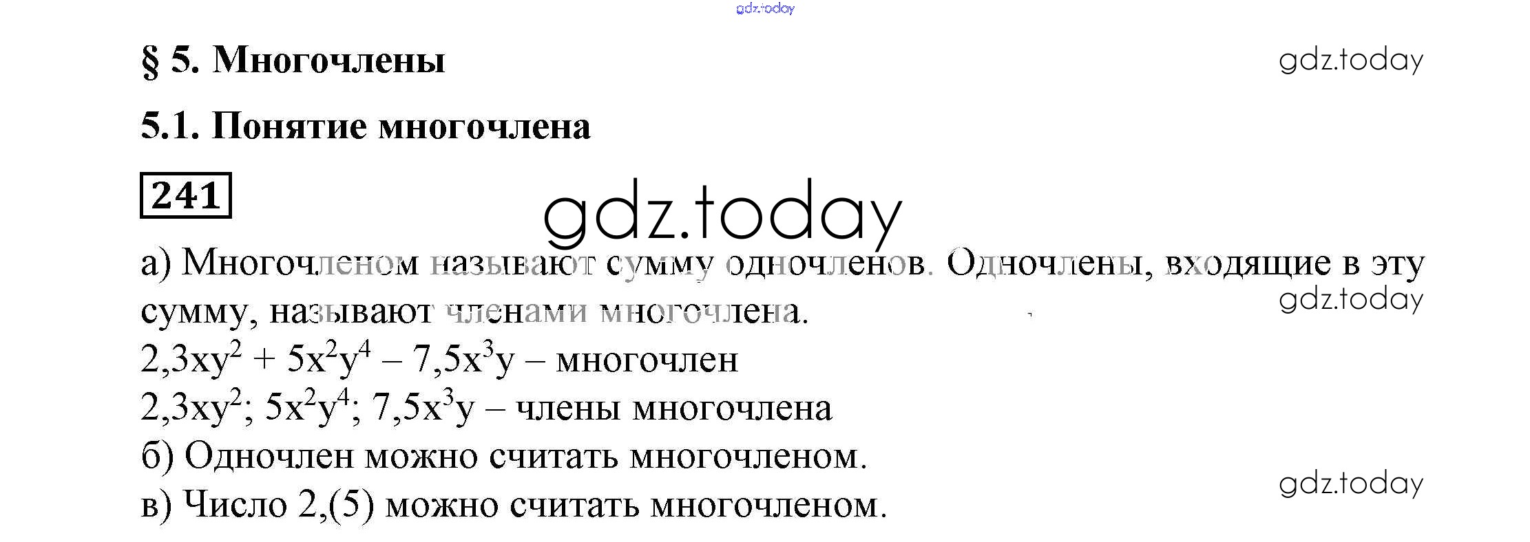 На страницах сайта gdz.today вы найдете учебный и вспомогательный материал, направленный на улучшения знаний школьной программы. ГДЗ - онлайн мир знаний Решение к eпражнениям 241 Учебнику по Алгебре для 7 класса Никольский, Потапов Просвещение МГУ - школе 2013