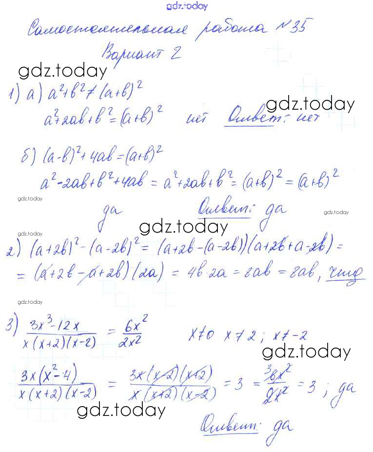 На страницах сайта gdz.today вы найдете учебный и вспомогательный материал, направленный на улучшения знаний школьной программы. ГДЗ - онлайн мир знаний СР-35 Решение к самостоятельным работам. Варианты 2 Контрольным и самостоятельным работам по Алгебре для 7 класса Попов Экзамен УМК 2017