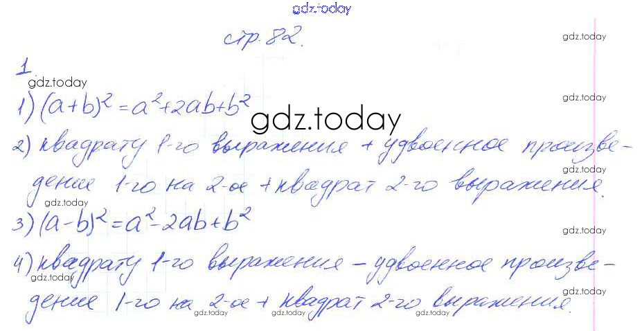 На страницах сайта gdz.today вы найдете учебный и вспомогательный материал, направленный на улучшения знаний школьной программы. ГДЗ - онлайн мир знаний § 16. Квадрат суммы и квадрат разности двух выражений. Страница 82-91 Решение. Часть 1 1 Рабочей тетради по Алгебре для 7 класса Мерзляк, Полонский Вентана-граф Алгоритм успеха 2018