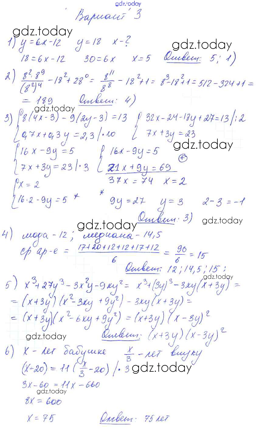 Ответы к КР-10 Решение к контрольным работам вариант 3 Самостоятельным и контрольным работам по Алгебре для 7 класса Глазков, Гаиашвили Экзамен УМК 2019