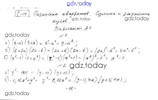На страницах сайта gdz.today вы найдете учебный и вспомогательный материал, направленный на улучшения знаний школьной программы. ГДЗ - онлайн мир знаний СР-14. Разность квадратов. Сумма и разность кубов Самостоятельные работы вариант А-1 Самостоятельным и контрольным работам по Алгебре для 7 класса Ершова, Голобородько Илекса 2015