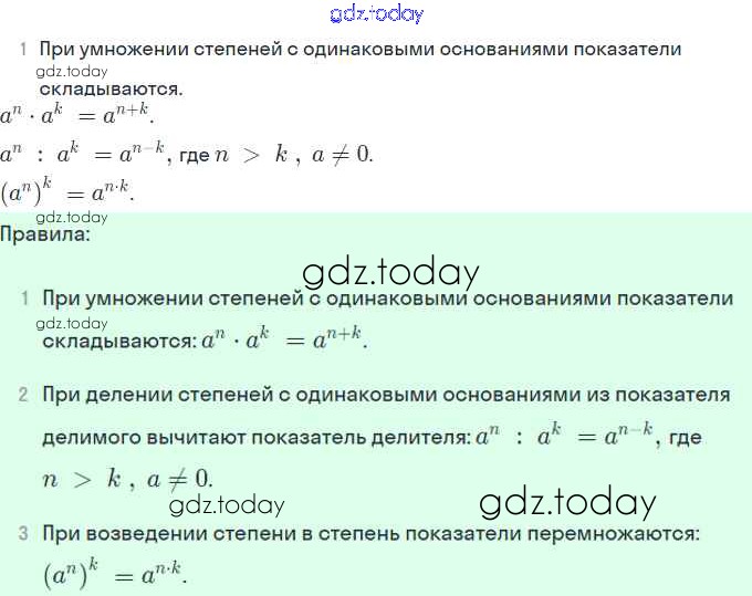На страницах сайта gdz.today вы найдете учебный и вспомогательный материал, направленный на улучшения знаний школьной программы. ГДЗ - онлайн мир знаний §17. Свойства степени с натуральными показателями Решение. Глава 4. Степень с натуральным показателем и её свойства 4 Учебнику по Алгебре для 7 класса Мордкович Базовый уровень Мнемозина 2013