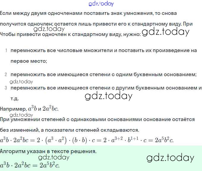 На страницах сайта gdz.today вы найдете учебный и вспомогательный материал, направленный на улучшения знаний школьной программы. ГДЗ - онлайн мир знаний §22. Умножение одночленов. Возведение одночлена в натуральную степень Решение. Глава 5. Одночлены. Арифметические операции над одночленами 1 Учебнику по Алгебре для 7 класса Мордкович Базовый уровень Мнемозина 2013