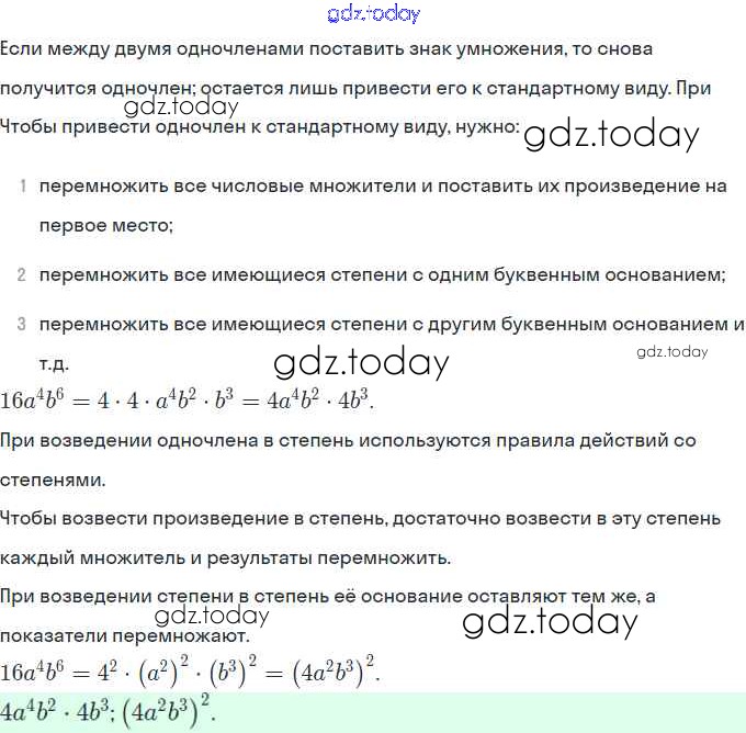 На страницах сайта gdz.today вы найдете учебный и вспомогательный материал, направленный на улучшения знаний школьной программы. ГДЗ - онлайн мир знаний §22. Умножение одночленов. Возведение одночлена в натуральную степень Решение. Глава 5. Одночлены. Арифметические операции над одночленами 4 Учебнику по Алгебре для 7 класса Мордкович Базовый уровень Мнемозина 2013