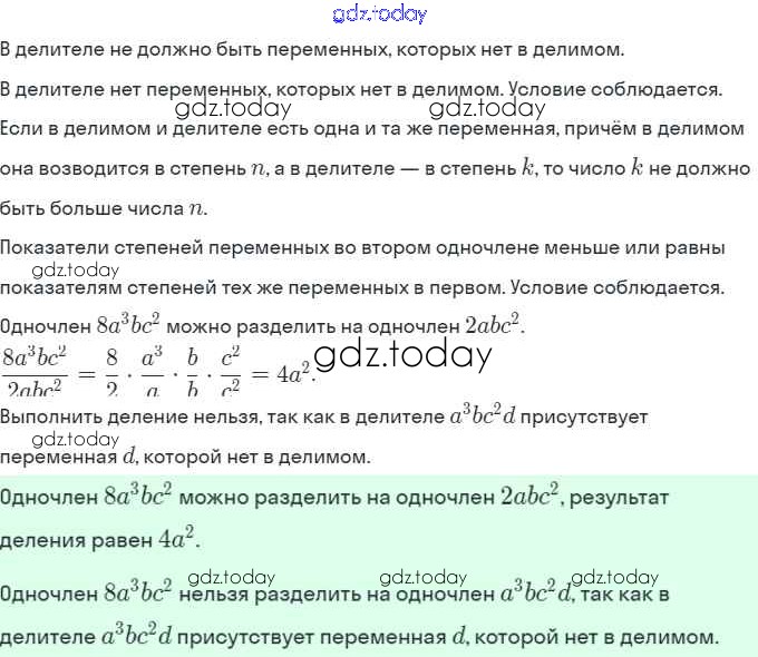 На страницах сайта gdz.today вы найдете учебный и вспомогательный материал, направленный на улучшения знаний школьной программы. ГДЗ - онлайн мир знаний §23. Деление одночлена на одночлен Решение. Глава 5. Одночлены. Арифметические операции над одночленами 2 Учебнику по Алгебре для 7 класса Мордкович Базовый уровень Мнемозина 2013