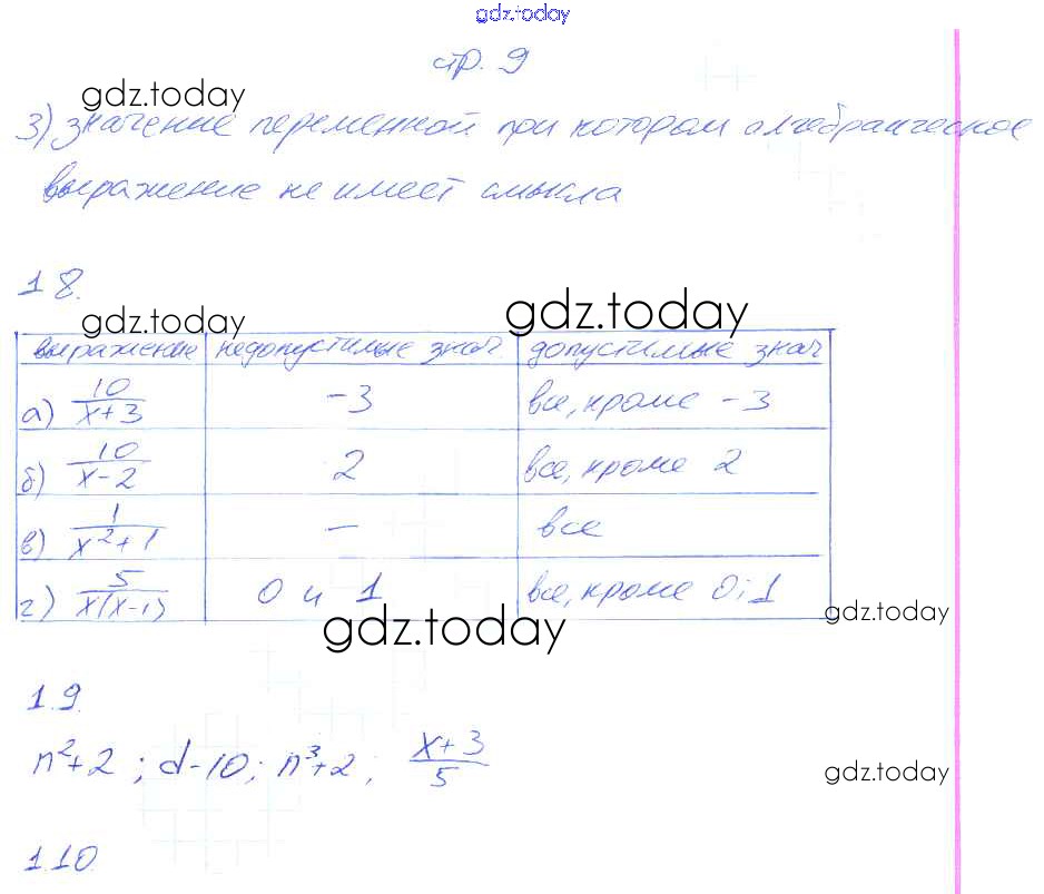 На страницах сайта gdz.today вы найдете учебный и вспомогательный материал, направленный на улучшения знаний школьной программы. ГДЗ - онлайн мир знаний Решение к части 1. Страницы 9 Рабочей тетради по Алгебре для 7 класса Зубарева, Мильштейн Мнемозина 2019