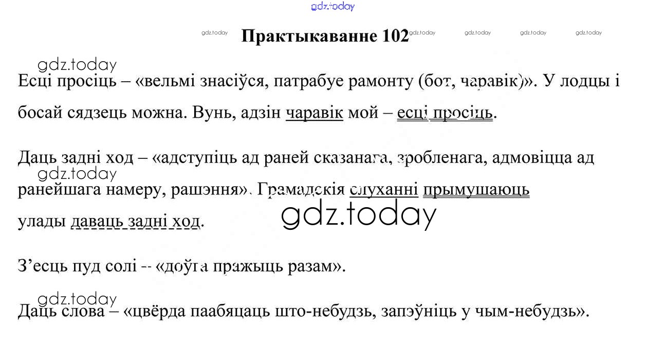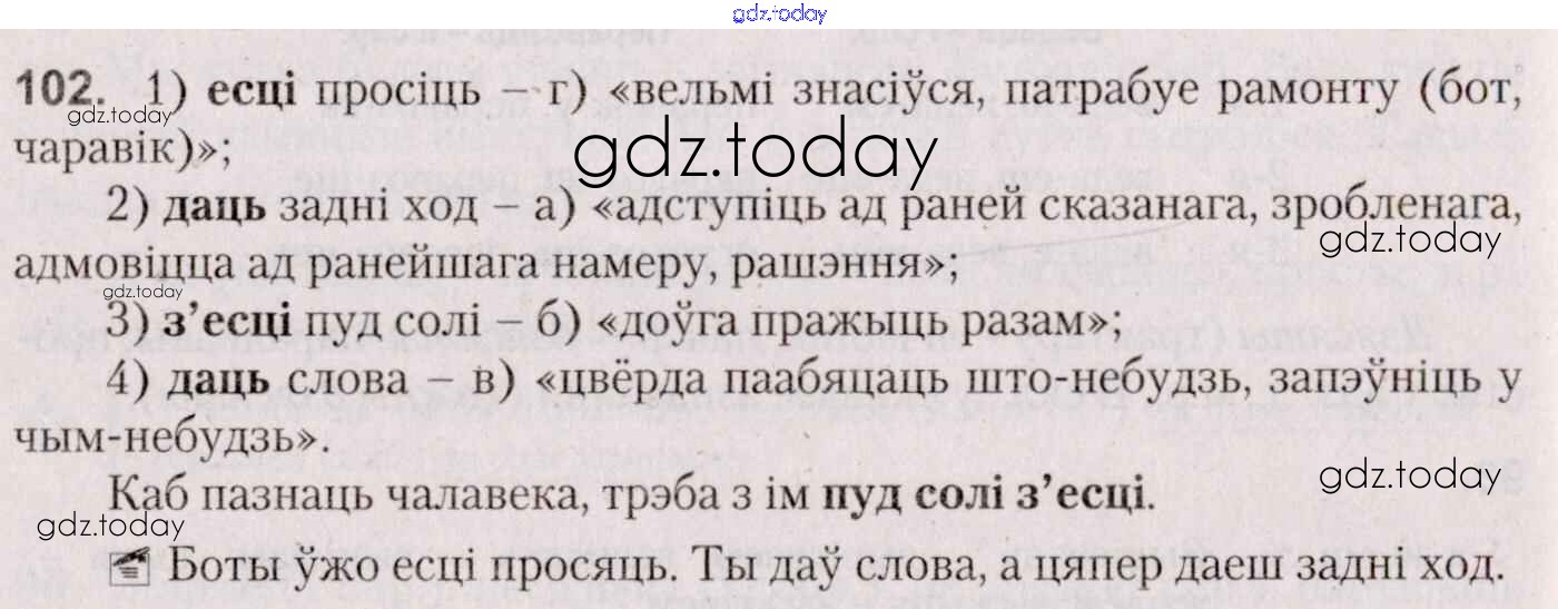 На страницах сайта gdz.today вы найдете учебный и вспомогательный материал, направленный на улучшения знаний школьной программы. ГДЗ - онлайн мир знаний Практыкаванні 102 Учебнику по Белорусскому языку для 7 класса Валочка, Язерская Национальный институт образования 2020