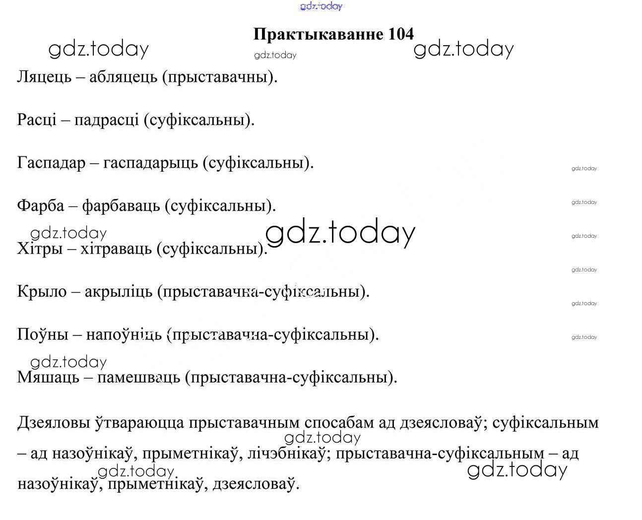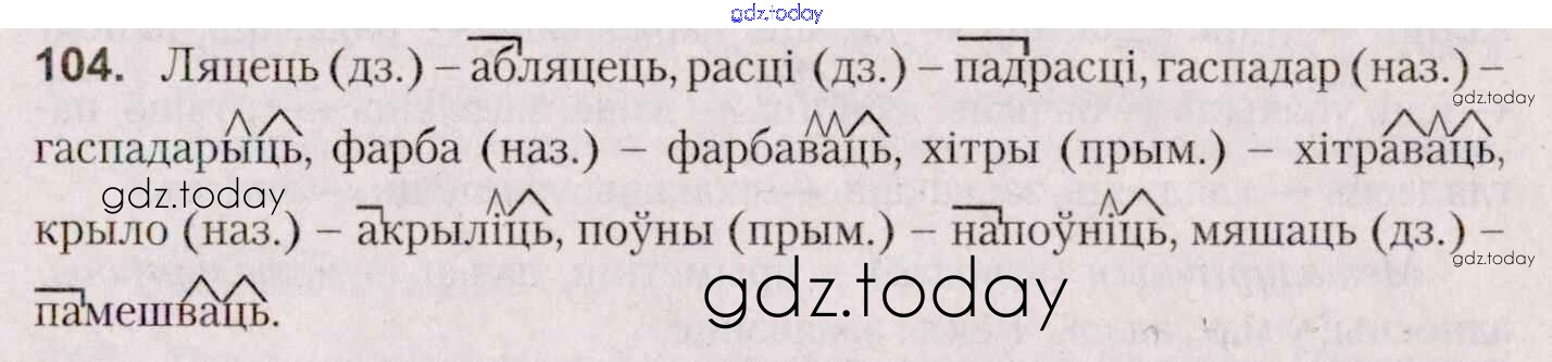 На страницах сайта gdz.today вы найдете учебный и вспомогательный материал, направленный на улучшения знаний школьной программы. ГДЗ - онлайн мир знаний Практыкаванні 104 Учебнику по Белорусскому языку для 7 класса Валочка, Язерская Национальный институт образования 2020